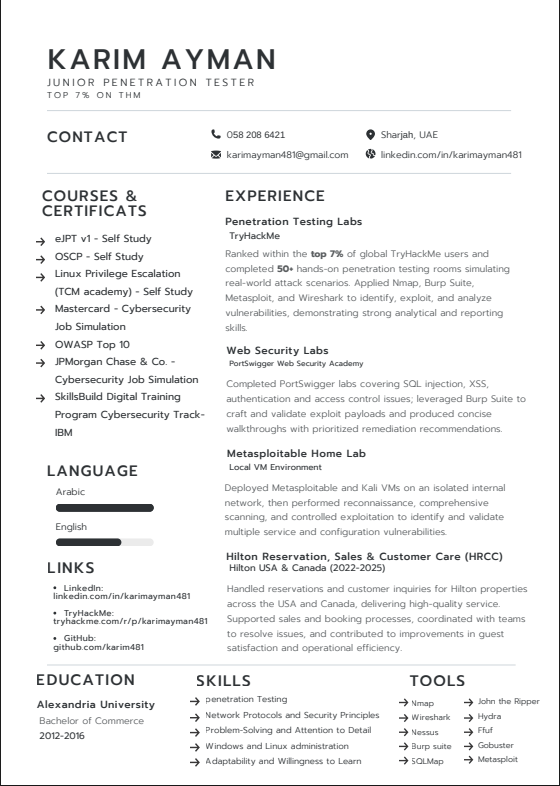 Junior Cybersecurity/ IT professional with hands - on experience in cybersecurity, penetration testing, and network security through labs and practical training. Strong understanding of TCP/ IP, traffic analysis, firewall concepts, NAT, and troubleshooting. Experience with Nmap, Wireshark, Metasploit, Burp Suite, and Nessus. Open to Cybersecurity or any IT - related role. Available in UAE