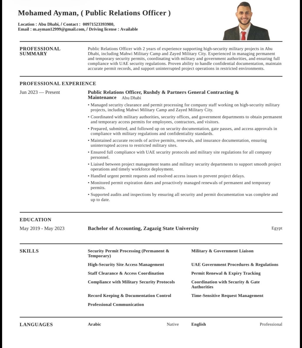 لدي خبرة في مجال المقاولات العامة عملت مع الأشغال العسكرية لدي رخصة قيادة وأتحدث الانجليزية بشكل ممتاز