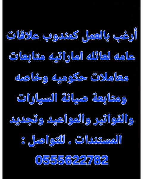 أرغب في العمل مندوب علاقات عامة لعائلة اماراتية متابعات معاملات حكوميه وخاصه ومتابعة صيانة السيارات والفواتير والمواعيد وتجديد المستندات. للتواصل