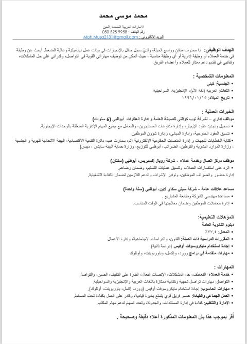 Egyptian with 7 + years of experience in the UAE, skilled in restaurants, customer service, sales, security, and construction. Fluent in Arabic and English, fast learner, and strong team player. Currently available full time with my own visa. Seeking a better opportunity to grow and support company goals. Ready to join immediately