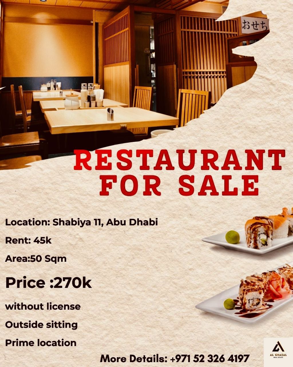Restaurant for sale Location Shabiya 11, Abu Dhabi Area 50 SQM Price 270000 Without license Outside sitting Prime location Contact us for more details