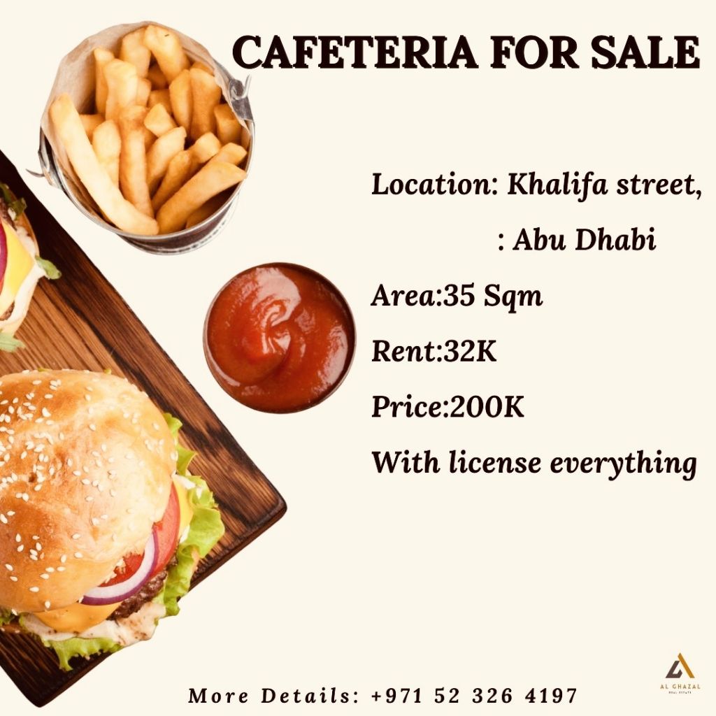 Cafeteria for sale Location Khalifa street, Abu Dhabi Area 35 SQM rent 32000 Price 200000 With license everything Contact us for more details