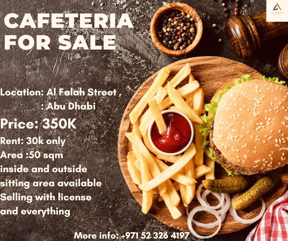 Cafeteria for sale Location Falah Street, Abu Dhabi Price 350 rent 30000 only Area 50 SQM inside and outside sitting area available Selling with license and everything Contact us for more details