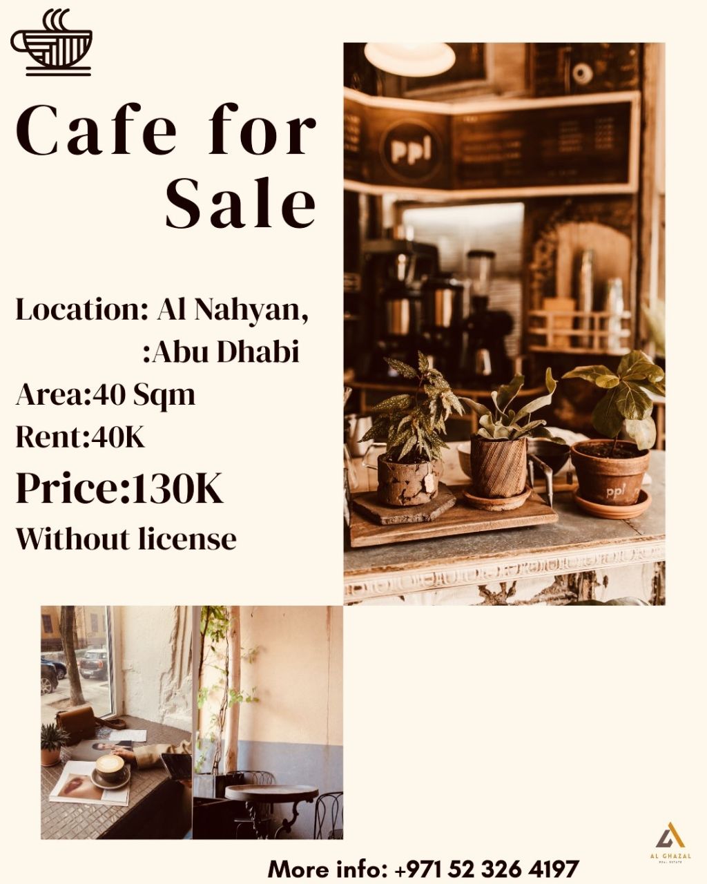 Café for sale Location Al Nahyan, Abu Dhabi Area 40 SQM rent 40000 Price 130000 Without License Contact us for more details