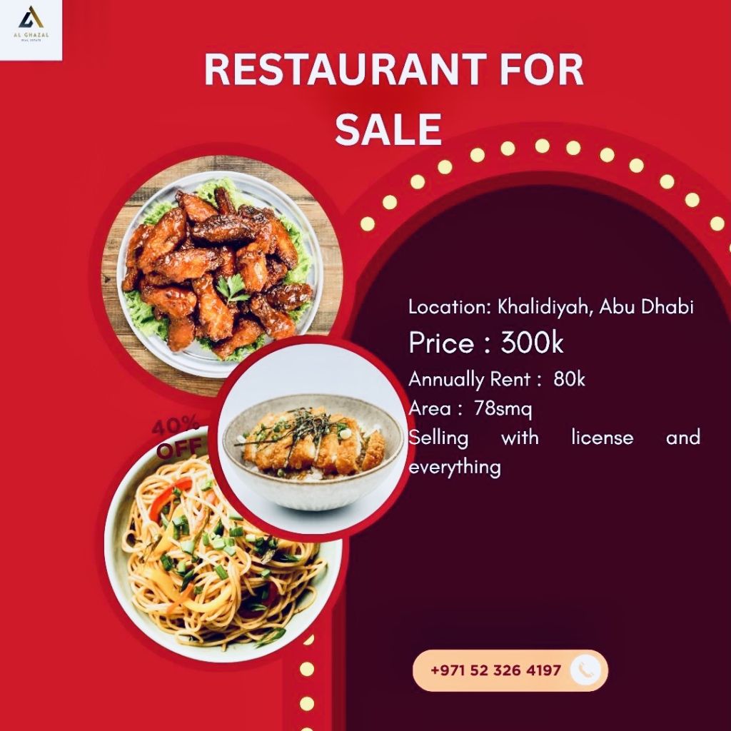 Restaurant for sale Location Khalidiyah, Abu Dhabi Price - 300000 Annually rent - 80000 Area SQM - 78 smq Selling with license and everything Contact us for more details
