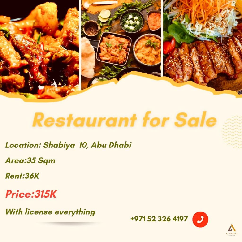 Restaurant for sale Location Shabiya 10, Abu Dhabi Price 315000 rent 36000 Area 35 SQM Contact us for more details
