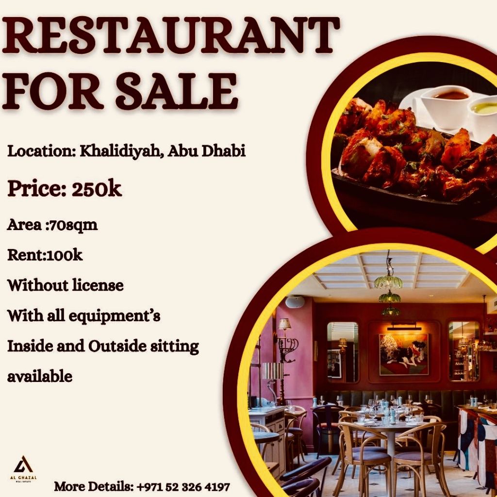 Restaurant for sale Location Khalidiyah, Abu Dhabi Price 250000 rent 100000 With license Area 70 SQM With all equipment Inside & Outside sitting available Contact us for more details