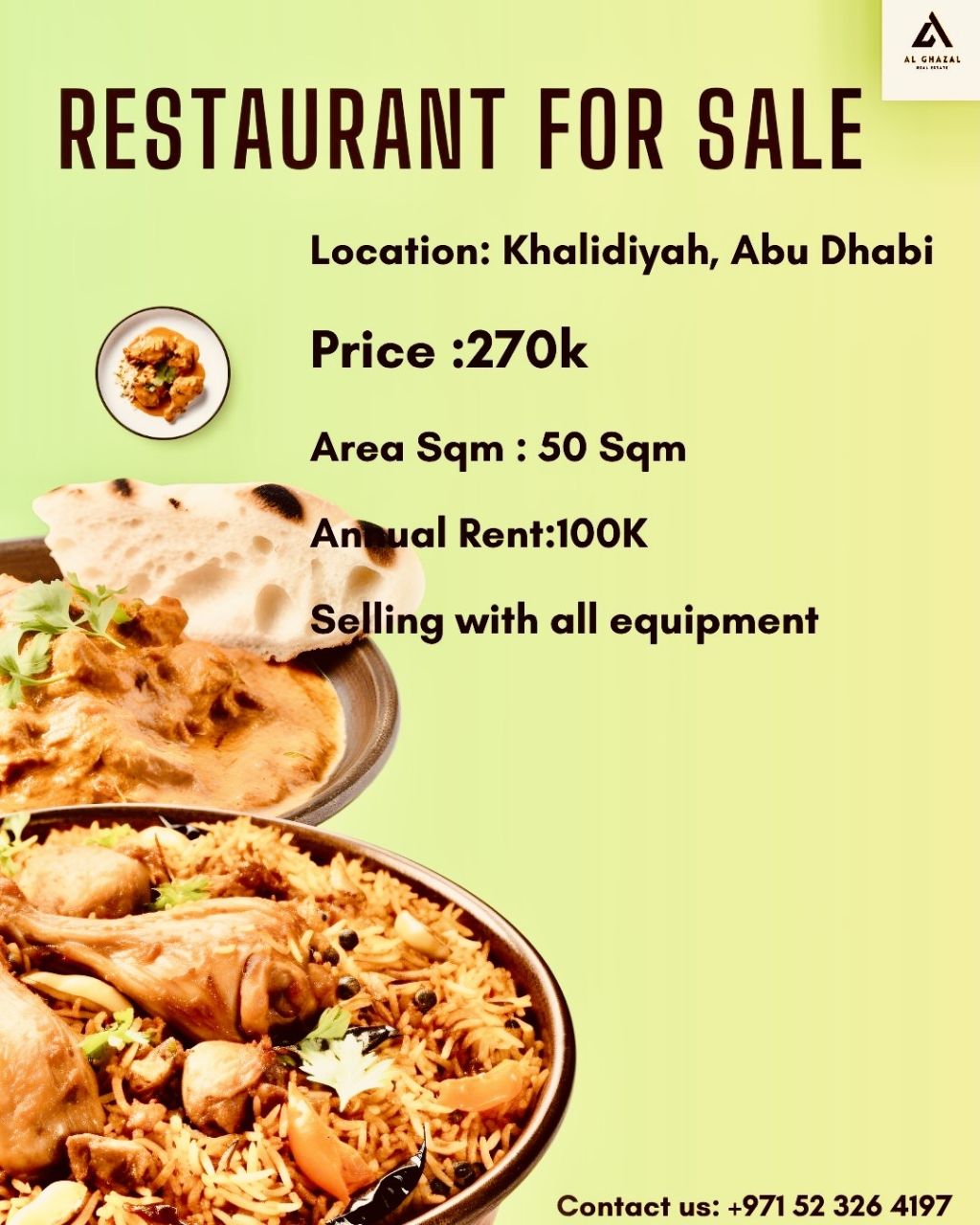 Restaurant for sale Location Khalidiyah, Abu Dhabi Price 270000 Area 50 SQM rent 100000 selling with all equipment Contact us for more details