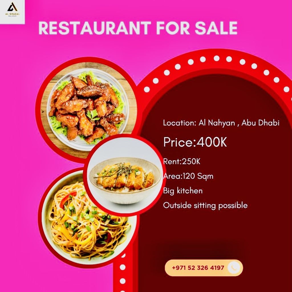 Restaurant for sale Location Al Nahyan. Abu Dhabi Price 400000 rent 250000 Area 120 SQM Big Kitchen Outside sitting Possible Contact us for more details