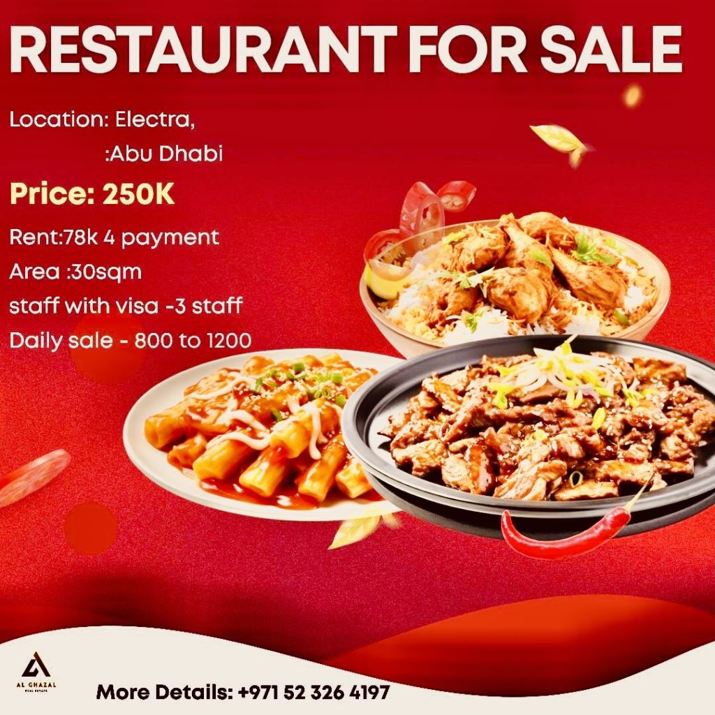 Restaurant for sale Location Electra, Abu Dhabi Price 250000 rent 78000 4 Payment Area 30 SQM Staff with visa 3 Daily sale 800 - AED1200 Contact us for more details