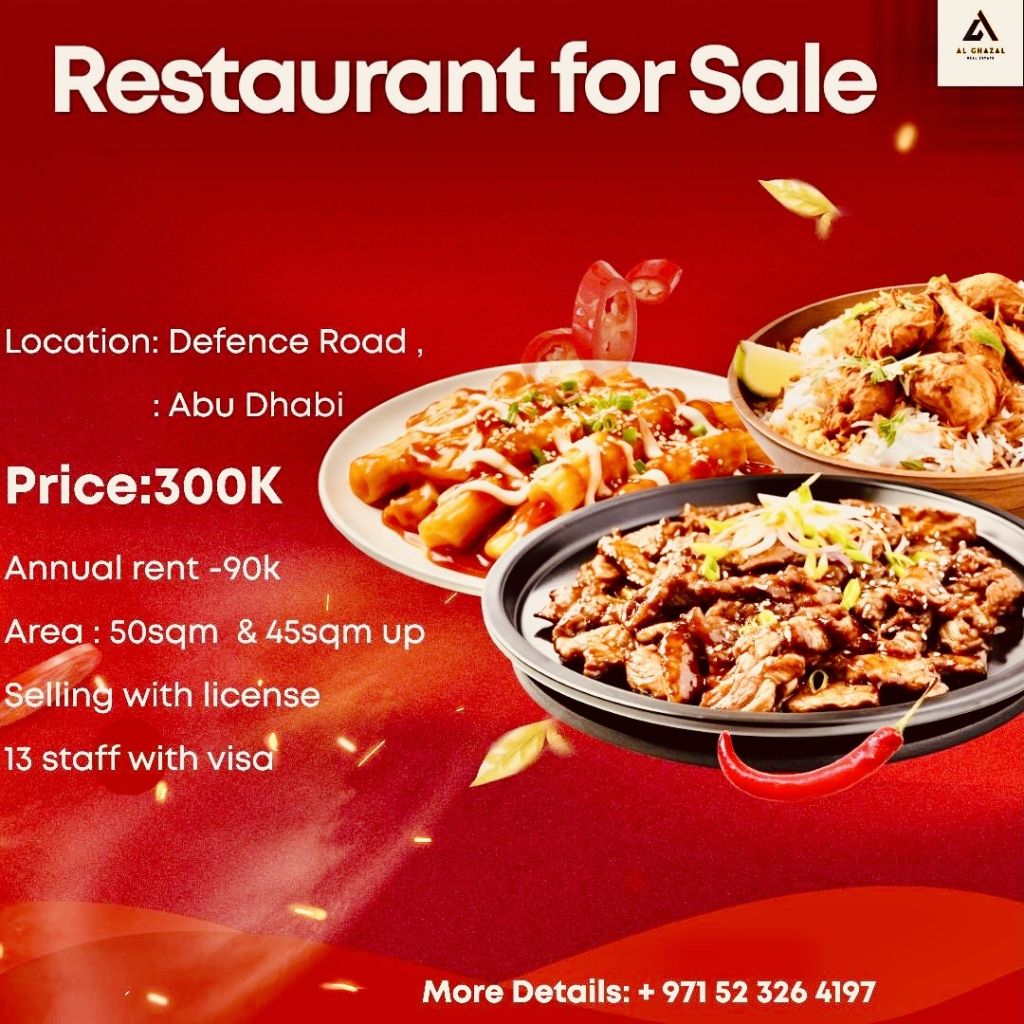 Restaurant for sale Location Defence Road Selling price - 300000 Annual rent - 90000 Area SQM - 50 SQM 45 SQM up Selling with license 13 staff with visa Contact us for more details