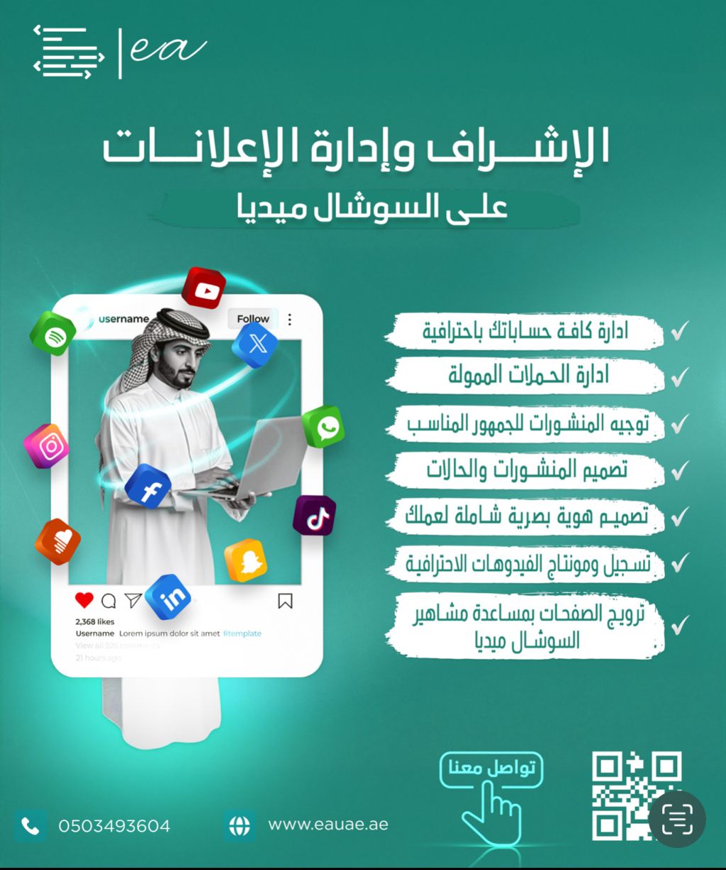 نوفر خدمة ادارة كافة حسابات السوشيال ميديا باحترافية وادارة الحملات الممولة وتوجيه المنشورات للجمهور المناسب وتصميم المنشورات والحالات والهايلايت بالاضافة لخدمة تصوير الفيديو المونتاج مع موديل تواصل معنا واطلع على كافة التفاصيل تصميم تصوير اشراف مونتاج دعاية اعلان فيديو