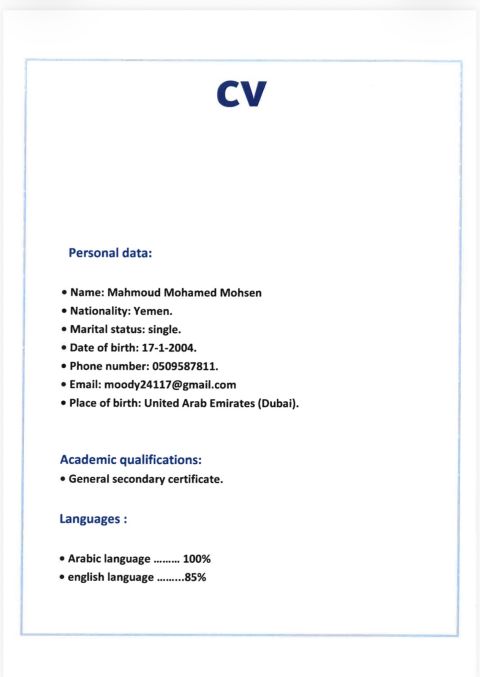 ابحث عن عمل في مجال الطباعة وتخليص المعاملات حيث انني ذو خبرة في المجال ولدي اقامة قابلة للاعارة جديدة حيث انني لدي عدة خبرة في مجالات أخرى مثل السيلز والعطور والهديا ولعب الاطفال خبرة تامة ولدي خبرة في سستم الجوازات والعمل والعمال وضمان وكتابة الاستر حمات والرسائل للمساعدات الخيريه