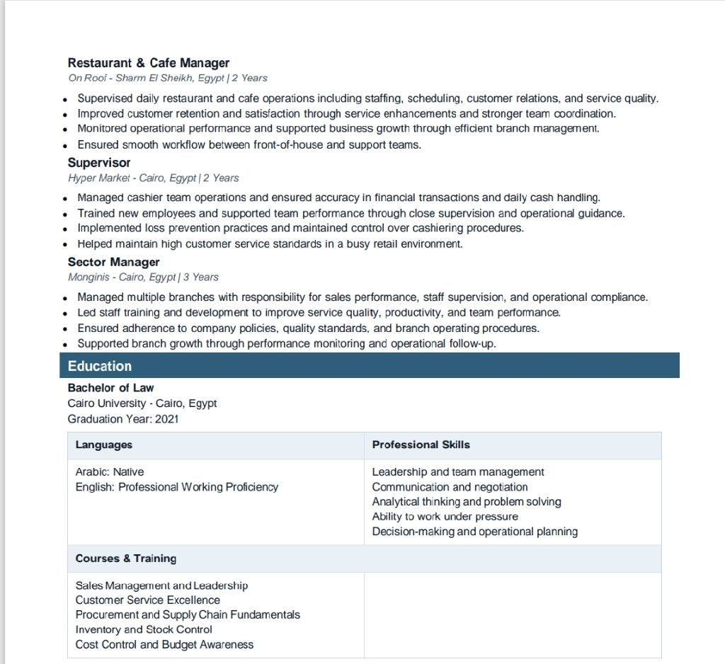 الخبرة الحالية مدير منطقة (Area Manager) في أبوظبي، مسؤول عن إدارة المبيعات والأداء المالي ل 6 فروع