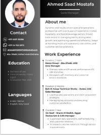 أنا أحمد سعد محمد مصطفى، مدير مبيعات ومناطق ذو خبرة تتجاوز 7 سنوات في مجال المبيعات وإدارة المطاعم والكافيهات في مصر والامارات. أتمتع بخبرة واسعة في تطوير الأداء البيعي إدارة الفرق، وتحقيق الأهداف التشغيلية والتسويقية، بالاضافة الى التعامل الفعال مع العملاء وبناء علاقات طويلة الأمد