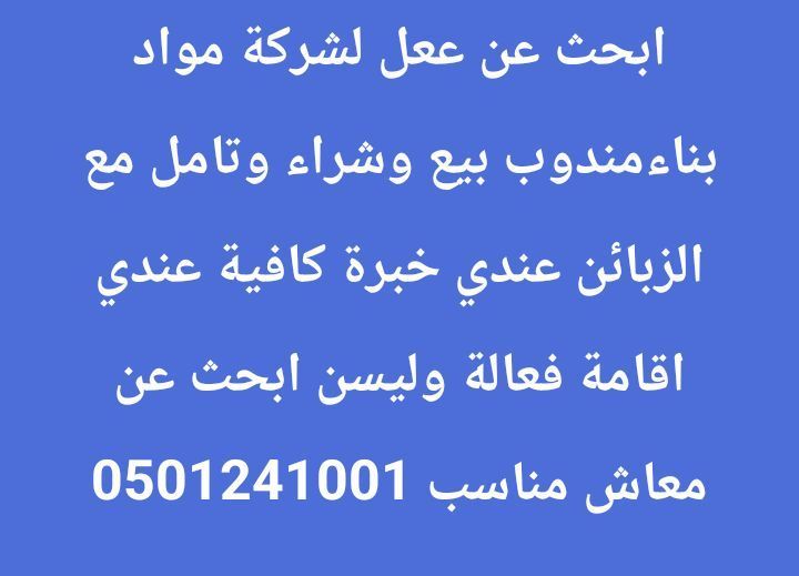 ابحث عن عمل في شركة مواد بناء مندوب وبيع وشراء وتعامل مع الزبائن لدي خبرة كافية عندي إقامة وليسن ابحث عن معاش مناسب