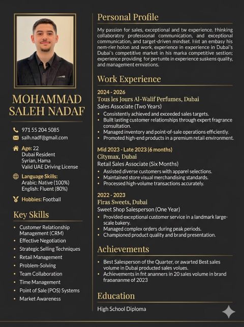 أنا من سوريا عمري 22 سنة خبرة في الامارات 4 سنوات سيلز ألبسة وعطورات خبرة أكبر ابحث عن فرصة عمل في شركة راقية وراتب ثابت بس يكون مش تحت 3500 وعمولة بما يرضي الله معي إقامة سارية لمدة 8 أشهر فقط وبتنتهي