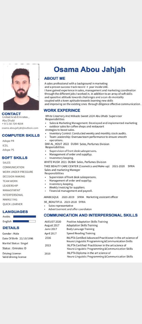 اسمي علي عبد السلام، 25 سنة متواجد حاليا في الامارات وابحث عن عمل في مجال المبيعات بدوام كامل أتميز بمهارات قوية في التواصل والاقناع وخدمة العملاء ولدي القدرة على تحقيق الأهداف وزيادة المبيعات من خلال بناء علاقات ناجحة مع العملاء. متفرغ تماما ومستعد للانضمام فورا للعمل بروح الفريق وتحت أي ضغط