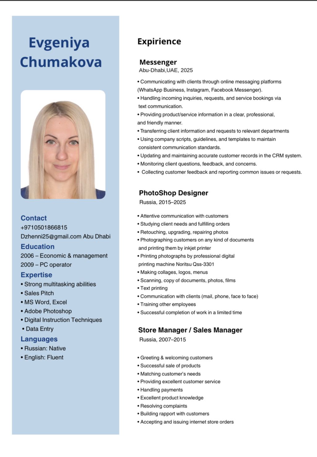 My name is Evgenia and I am from Russia. I am currently looking for a job in sales or customer service. I have experience in sales, client communication, Adobe Photoshop, and confident skills in working with computers and office equipment. Details are available in my CV. Please only serious employers