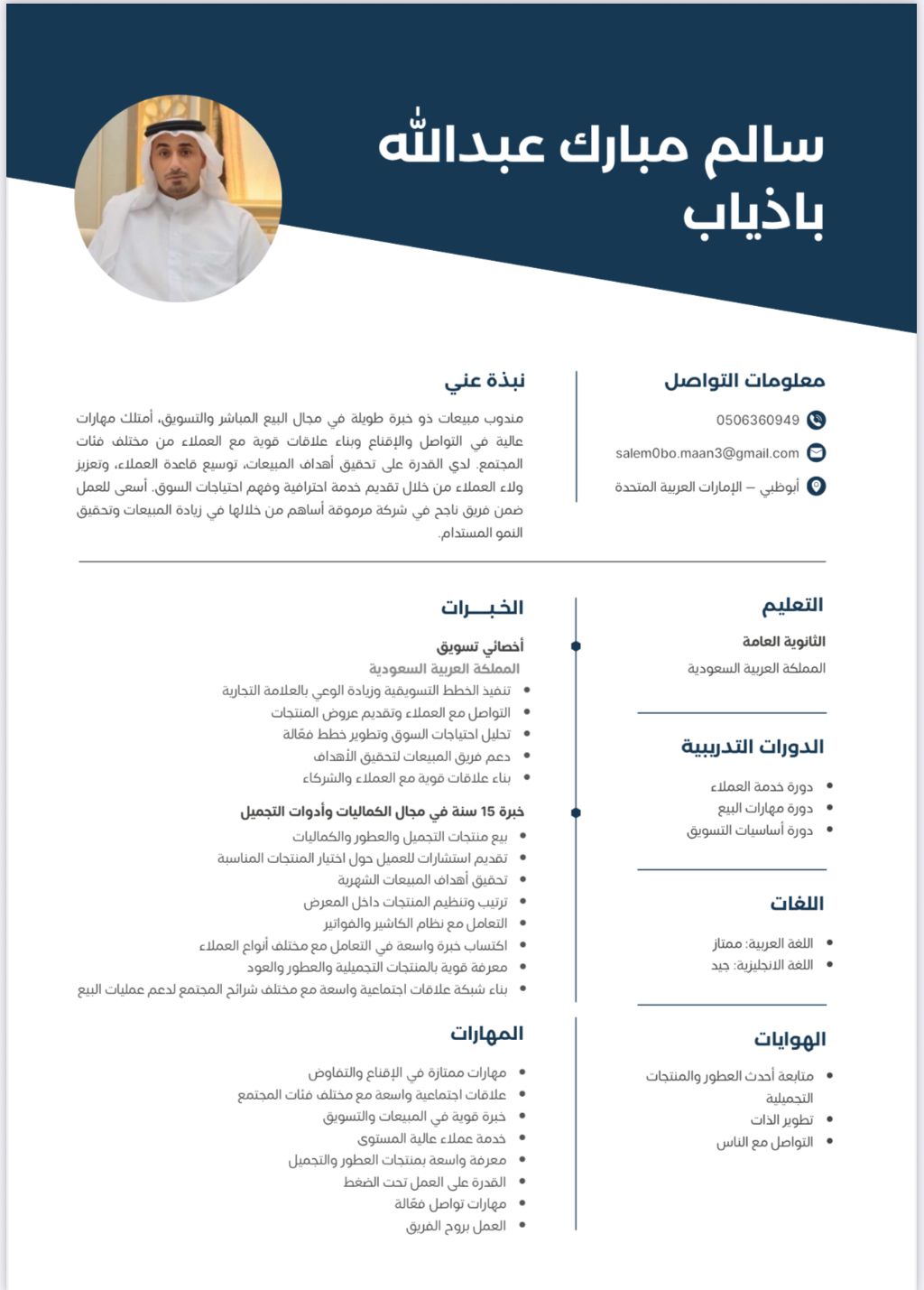 أرفق لكم سيرتي الذاتية للتقدم على وظيفة مبيعات وتسويق، حيث امتلك مهارات جيدة في التواصل مع العملاء، والعمل على تحقيق أهداف المبيعات، اضافة الى اهتمامي بتطوير مهاراتي في مجال التسويق وبناء العلاقات المهنية. أتطلع الى فرصة للانضمام الى فريقكم والمساهمة في تحقيق أهداف الشركة، ويسعدني مناقشة خبراتي ومهاراتي بشكل أوسع في حال تم منحي فرصة للمقابلة