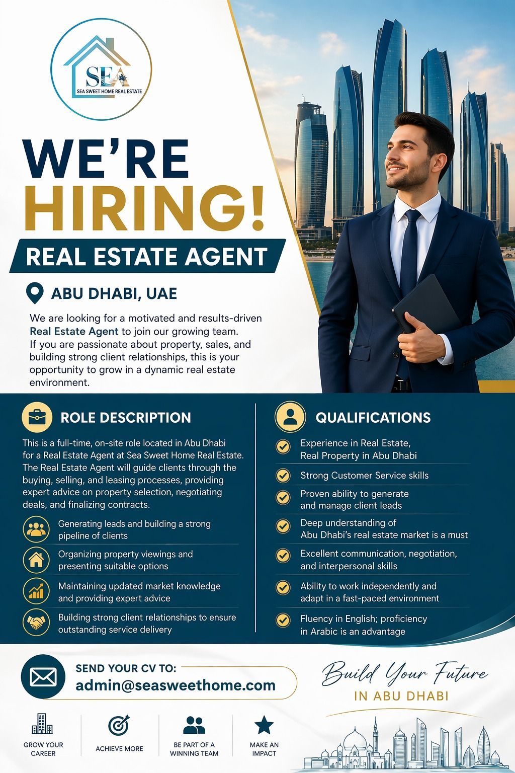 فرصة وظيفية مميزة في شركة عقارية - أبوظبي (الخالدية) تعلن الشركة عن توفر شواغر لوظيفة وسيط عقاري للانضمام الى فريق عمل احترافي وطموح. المتطلبات خبرة في البيع والشراء والتأجير ومشاريع أل Off - Plan مهارات تواصل قوية وقدرة على اغلاق الصفقات روح العمل الجماعي والالتزام بتحقيق الأهداف المزايا راتب شهري ثابت + عمولات مجزية توفير ليدز يوميا تدريب مستمر فرص للترقي الوظيفي أرسل سيرتك الذاتية