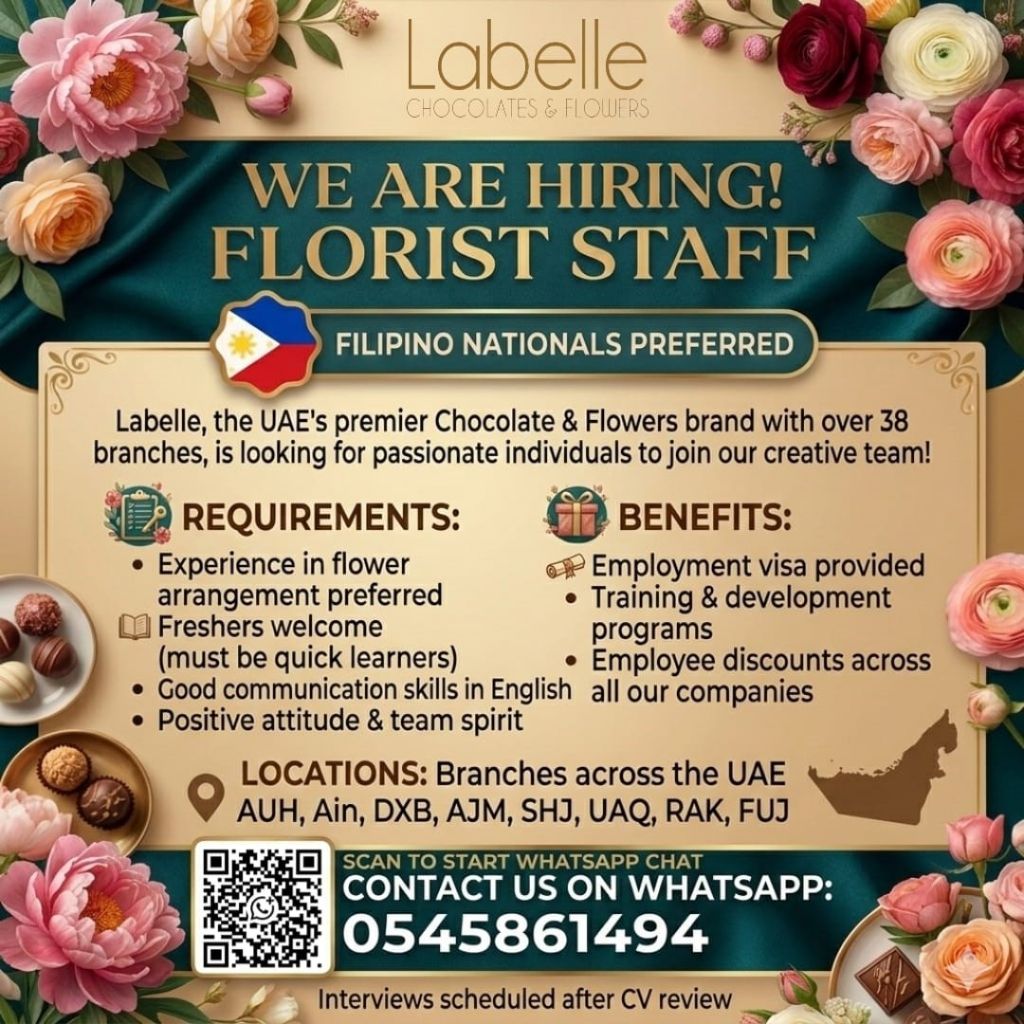Florist Staff Required - Labelle Chocolate & Flowers Labelle is a well - known brand in the UAE specializing in chocolate and flower arrangements, with more than 38 branches across the country. We are hiring Florists for our branches across the UAE. Requirements Experience in flower arrangement is a plus - Freshers are welcome if willing to learn quickly - Good communication skills in English - Positive