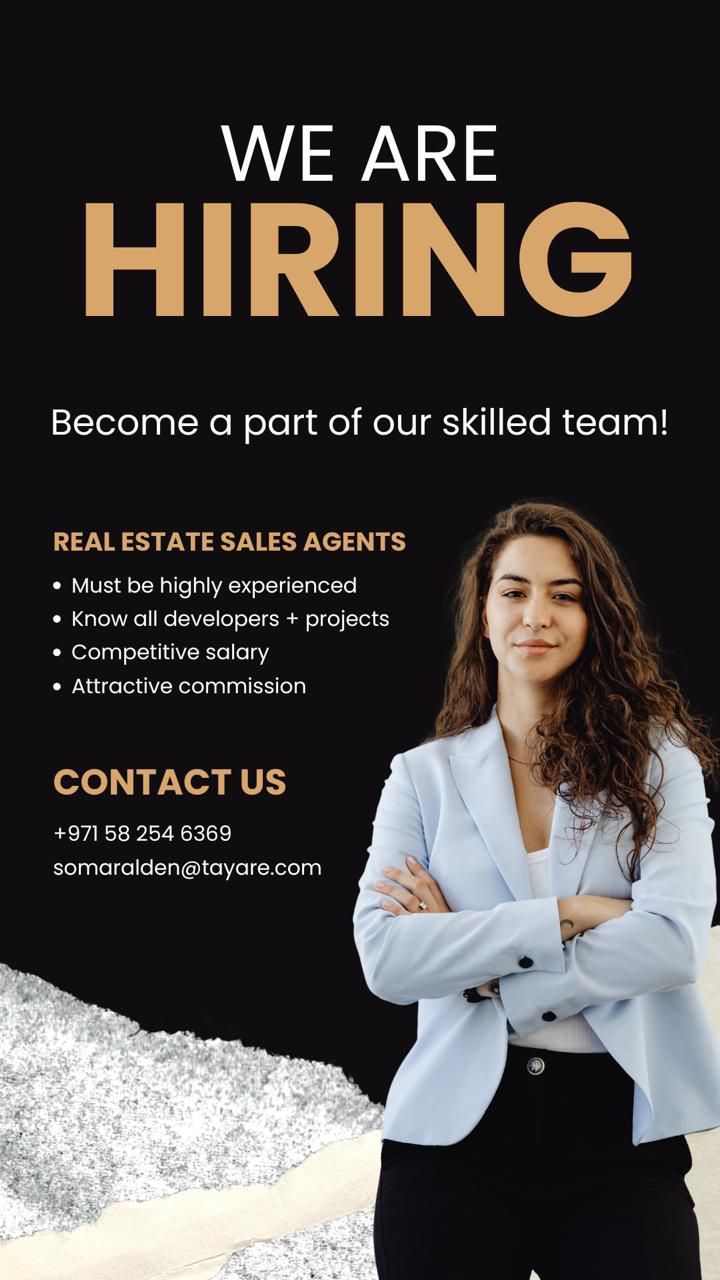We Are Hiring - real estate Sales Agents We are looking for real estate Sales Agents with 6 months - 1 year experience in real estate to join our team 6 - 12 months experience in real estate sales Basic knowledge of developers & projects Full training and support provided Salary based on interview + attractive commission Apply today and start your growth journey with us
