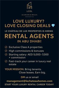 فرصة لمستشار عقاري للإيجارات في شركة لو شاتوا دو لوكس للعقارات - أبوظبي، حي الدانة، برج الخزنة. راتب أساسي 7000 درهم عند تحقيق 12 وحدة إيجار،400 درهم لكل وحدة قبل الهدف، و800 درهم لكل وحدة اضافية بعد الهدف. رخصة داري مطلوبة. عقارات فاخرة وبيانات جاهزة. انضم لفريق محترف وطموح وابدأ مسيرتك المهنية في العقارات الفاخرة