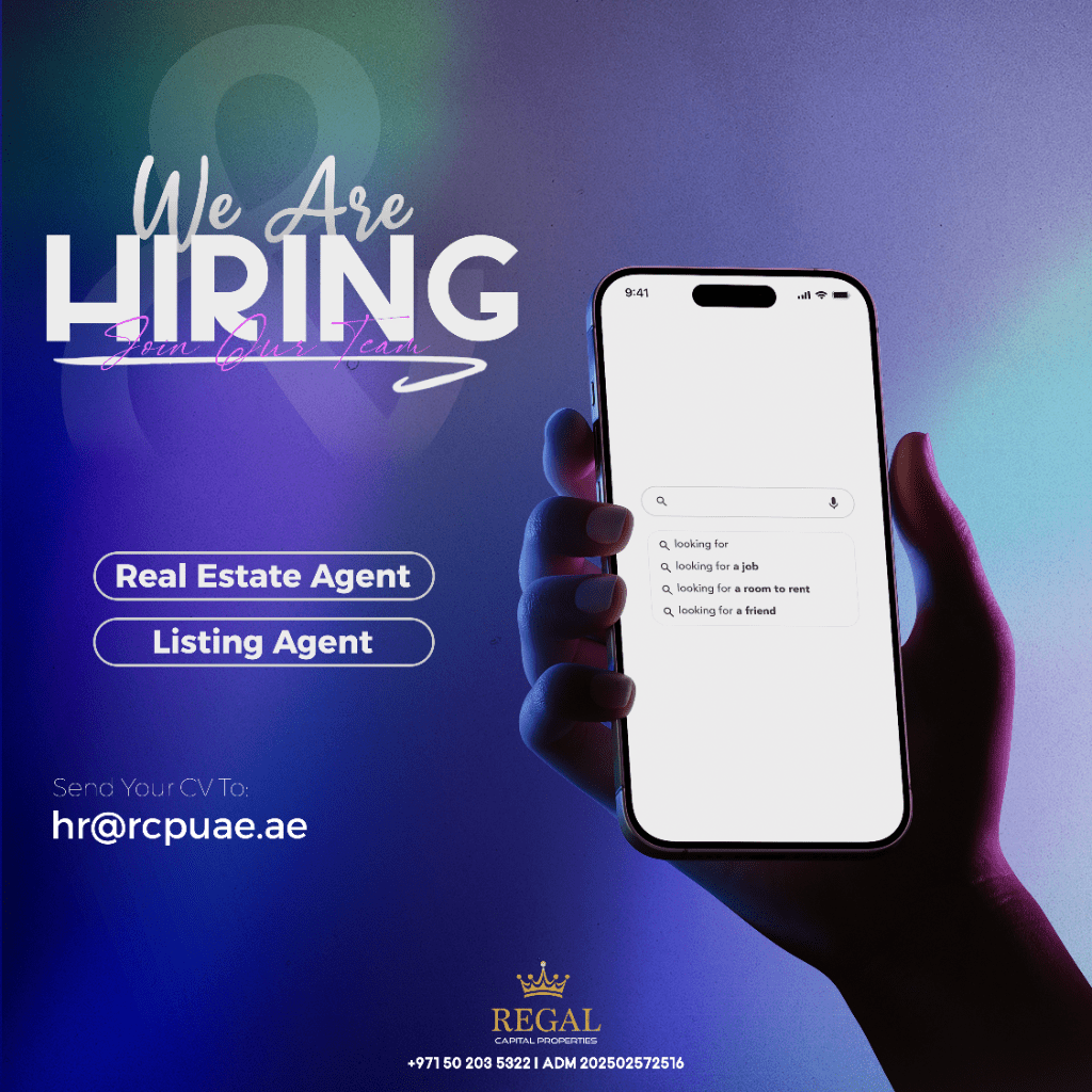 Hiring real estate Sales Agent Regal Capital Properties is looking for a motivated Sales Agent. Attractive commissions - Professional work environment - Growth opportunities Al Nahyan, Al Mamoura C54 floor 8