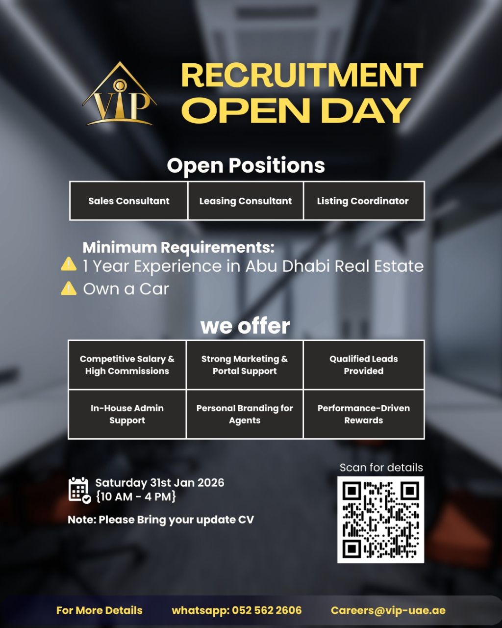 Recruitment Open Day VIP Brokerage - Abu Dhabi We’ re expanding and looking for experienced real estate professionals ready to grow, earn, and close quality deals. Open Roles Sales Consultants Leasing Consultants Listing Coordinators Saturday, 31st Jan 2026 10 AM - 4 PM Abu Dhabi If you have at least 1 year of Abu Dhabi real estate experience and own a car, we want to meet you. Bring your updated