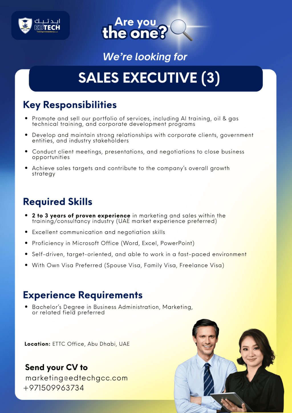 We’ re Hiring EdTech Training & Consultancy is looking for Sales Executives (3) to join our Abu Dhabi team. If you have UAE market experience, strong communication skills, and a passion for achieving targets we want to hear from you Location Abu Dhabi Send your CV to Apply now and grow your career with us