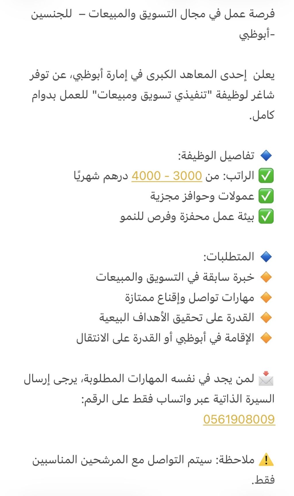 مطلوب من كلا الجنسين لمعهد مرموق في أبوظبي، شارع المرور للعمل الفوري سليز ومسوقين عبر الهاتف الأولية لمن يمتلك الخبرة