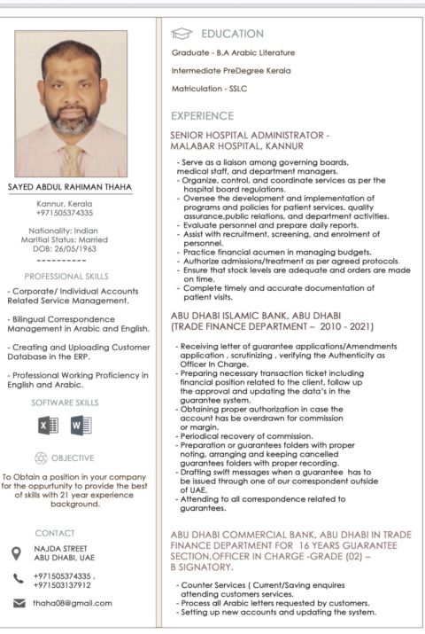 أقيم حاليا في أبوظبي بتأشيرة زيارة. أرجو الاطلاع على سيرتي الذاتية المرفقة لشغل وظيفة مناسبة في مؤسستكم الموقرة. لدي خبرة مصرفية تمتد ل 28 عاما في أبوظبي، وأجيد اللغتين العربية والانجليزية بطلاقة، كما أحمل رخصة قيادة اماراتية