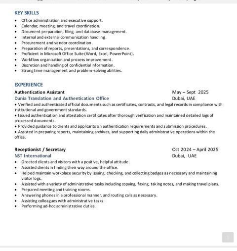 سكرتير ومساعد اداري بخبرة أربع سنوات في بيئة عمل احترافية، ملم بإدارة المكاتب، تنسيق الاجتماعات، اعداد التقارير، واستخدام Microsoft Office بكفاءة، سوداني الجنسية
