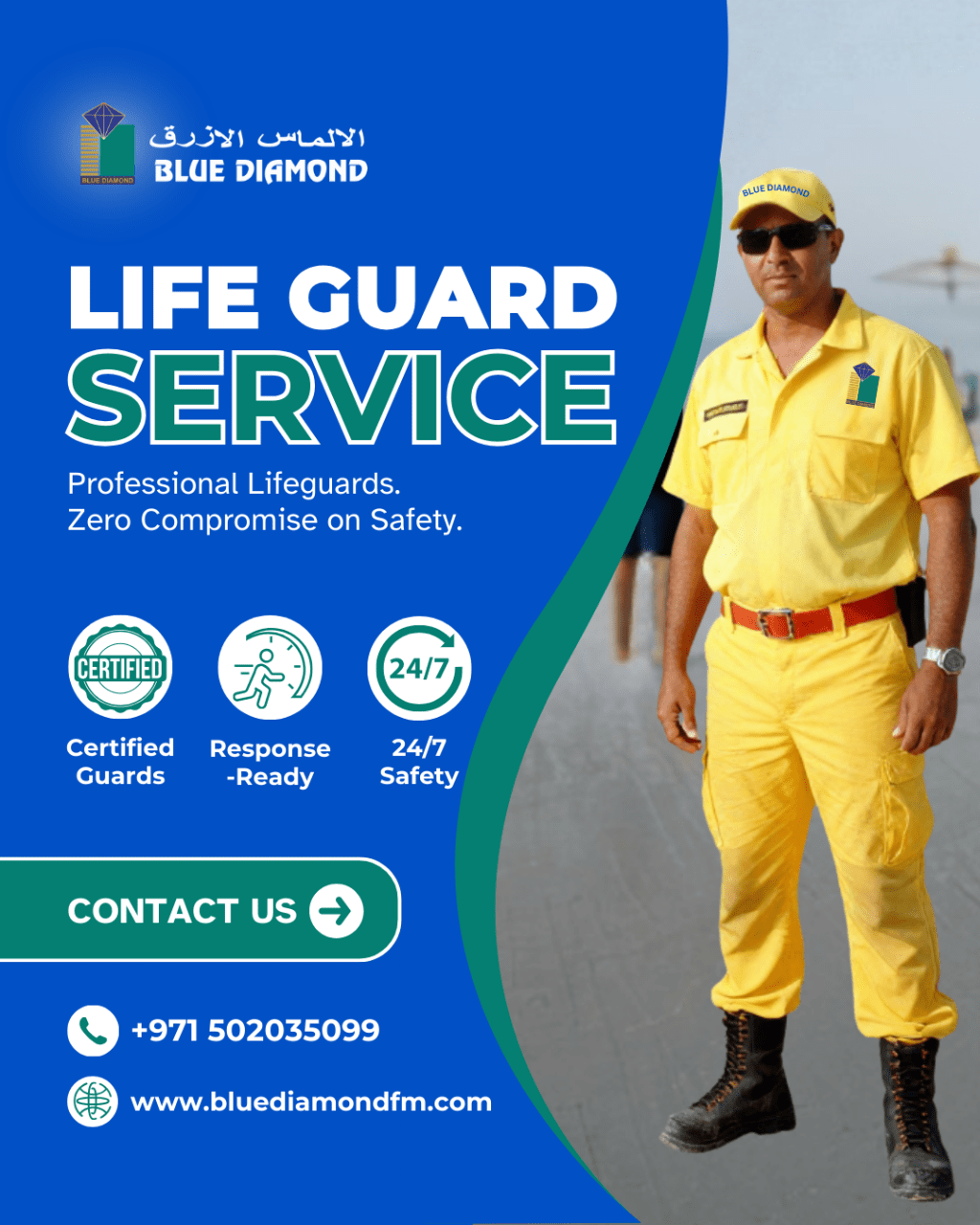 Stay safe with professional life guard support. Certified guards Fast response 24/ 7 safety coverage Reliable supervision for pools and water facilities Protect your space with trusted safety professionals. Blue Diamond, delivering reliable facility solutions across the UAE