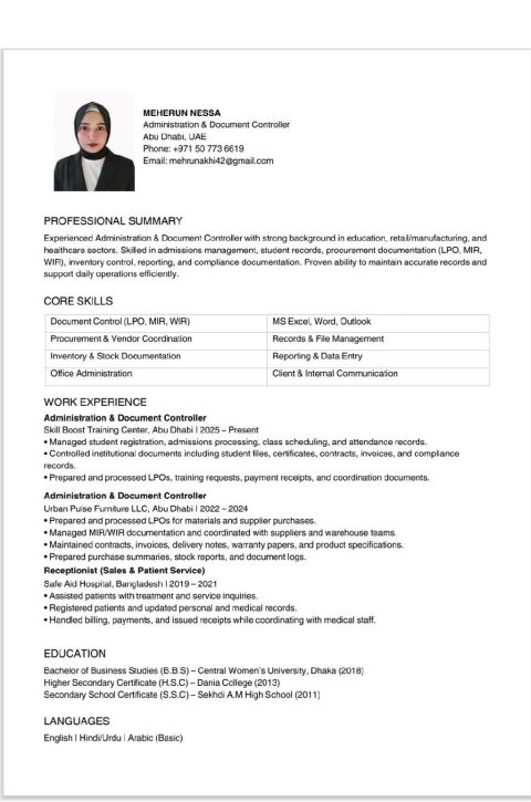 مرحبا بالجميع، أنا حاليا ابحث عن فرصة عمل مناسبة في أبوظبي. لدي خبرة اجمالية لمدة 3 سنوات في دولة الامارات، منها أكثر من سنتين في المجال الاداري. أرغب في العمل في احدى الوظائف التالية الإدارة / مراقب مستندات / خدمة العملاء / موظف استقبال. امتلك خبرة في اعداد التقارير - التنسيق مع العملاء وفريق العمل - إدارة العمليات - اجادة استخدام برامج Microsoft Excel وOutlook أنا متاحة للانضمام بشكل فوري