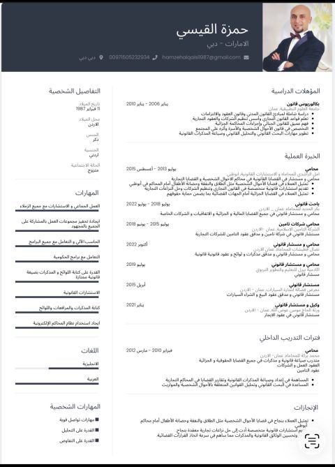 أنا محامي أردني حاصل على إجازة في الحقوق من جامعة العلوم التطبيقية، بالاضافة الى كتابة المذكرات والطعون واستخدام نظام المحاكم. ابحث عن فرصة عمل في دولة الامارات أجيد استخدام الحاسوب، تنظيم الملفات، وامتلك مهارات جيدة في البحث القانوني والتواصل