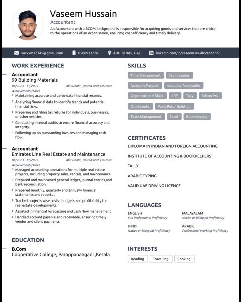 My name is vaseem husain. Am from india Kerala, I am looking for job as an accountant. I have 3 years experience as an accountant in real estate, Building Materials and construction, I have valid UAE driving license and now am in Abu Dhabi Mussafah Shabiya 10