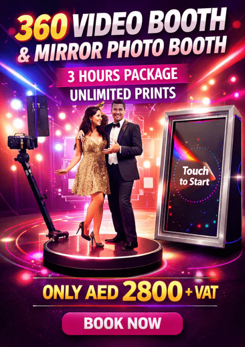 360 فيديو بوث + فوتوبوث أو ميرور بوث تبدأ من 2800 درهم اجعل مناسبتك مميزة مع تجربة 360 فيديو بوث مع خيار اضافة فوتوبوث أو ميرور بوث مثالية للأعراس وأعياد الميلاد والفعاليات 360 فيديو بوث مع مشاركة فورية خيار اضافة فوتوبوث أو ميرور بوث 3 ساعات تشغيل طباعة غير محدودة (للفوتوبوث / الميرور بوث) تجهيز كامل مع مشرف متخصص امكانية اضافة شعار أو تصميم مخصص الأسعار تبدأ من 2800 درهم متوفرين في جميع أنحاء الامارات