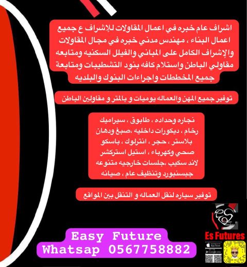 اشراف عام خبرة في أعمال المقاولات للاشراف ع جميع أعمال البناء والإنشاءات مهندس مدني خبرة للاشراف ع المباني والفلل السكنيه ومتابعه مقاولي الباطن واستلام كافة بنود التشطيبات ومتابعة جميع المخططات واجراءات البنوك والبلدية توفير العماله ومقاولين الباطن نجاره وحدادة طابوق سيراميك ديكورات داخليه صبغ ودهانات بلاستر حجر انترلوك وباسكو وجميع الأعمال صيانة وتنظيف عام للمواقع مع توفير سيارة لتنقل بين المواقع