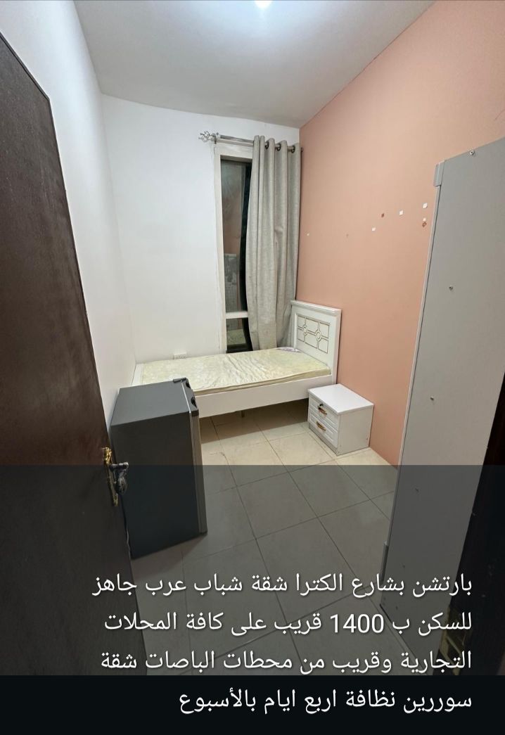 بارتشن في شارع الكترا شقة شباب عرب جاهز للسكن ب 1400 قريب على كافة المحلات التجارية وقريب من محطات الباصات شقة سوريين نظافة أربع أيام بالأسبوع