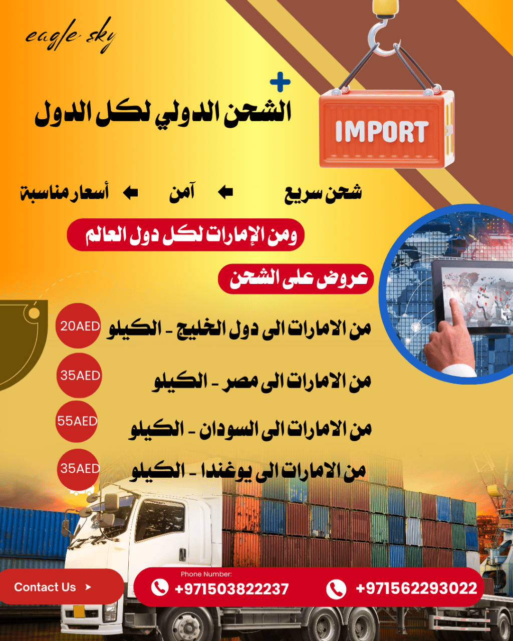 الشحن الدولي لكل الدول ومن الامارات لكل دول العالم 1 - من الامارات الى دول الخليج الكيلو 2 - من الامارات الى مصر - الكيلو 3 - من الامارات الى السودان - الكيلو 4 - من الامارات الى يوغندا الكيلو