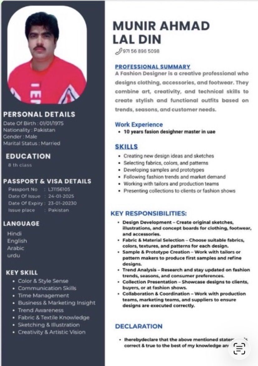 My name is Munir. I am from Pakistan. I am professional cutter master (fustian any model) my experience 12 years in UAE. I need a job