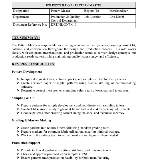 Pattern Development Interpret design sketches, technical packs, and samples to develop first patterns. Create accurate paper or digital patterns using manual drafting or pattern - making software. Determine correct measurements, grading rules, seam allowances, and tolerances. Sampling & Fit Prepare patterns for sample development and coordinate with sampling tailors. Conduct fit sessions, analyze garment