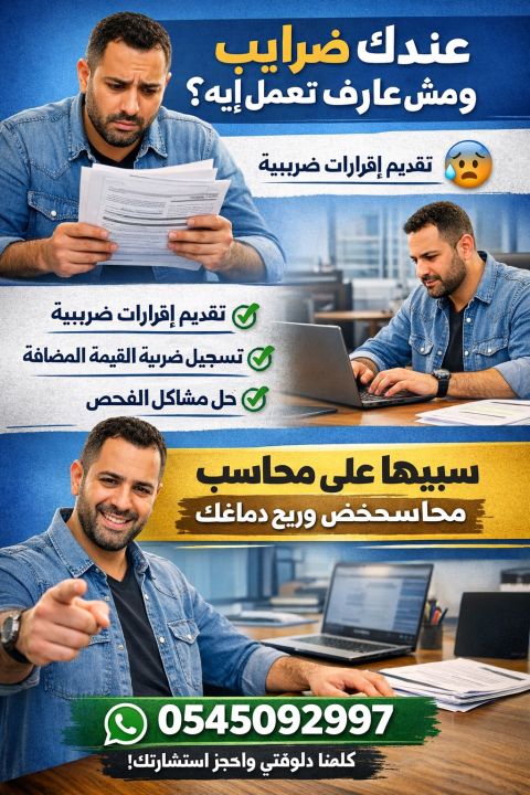 عندك ضرايب ومش عارف تبدأ منين سيبها علينا وركز في شغلك تقديم الاقرارات الضريبية تسجيل ضريبة القيمة المضافة (VAT) مسك حسابات للشركات والأفراد حل مشاكل الفحص الضريبي خبرة ودقة في الشغل التزام بالمواعيد للتواصل والاستفسار (واتساب / اتصال)