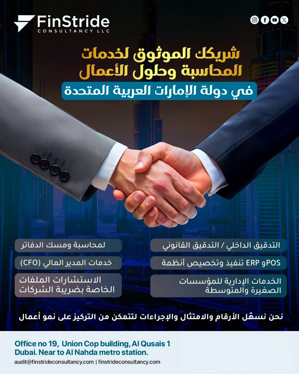شركة فينسترايد للاستشارات ذ م نعزز بيئة مالية متكاملة خبرتنا الأساسية خدمات المحاسبة والامتثال المحاسبة ومسك الدفاتر - بما في ذلك مسك الدفاتر المتراكمة) تقديم اقرارات ضريبة القيمة المضافة وضريبة الشركات - الامتثال لمكافحة غسل الأموال - الاستشارات الضريبية والمخاطر - استشارات القيمة المضافة - خدمات التدقيق خدمات التدقيق القانوني - خدمات التدقيق الداخلي - حلول استشارية واستراتيجية الاستراتيجية