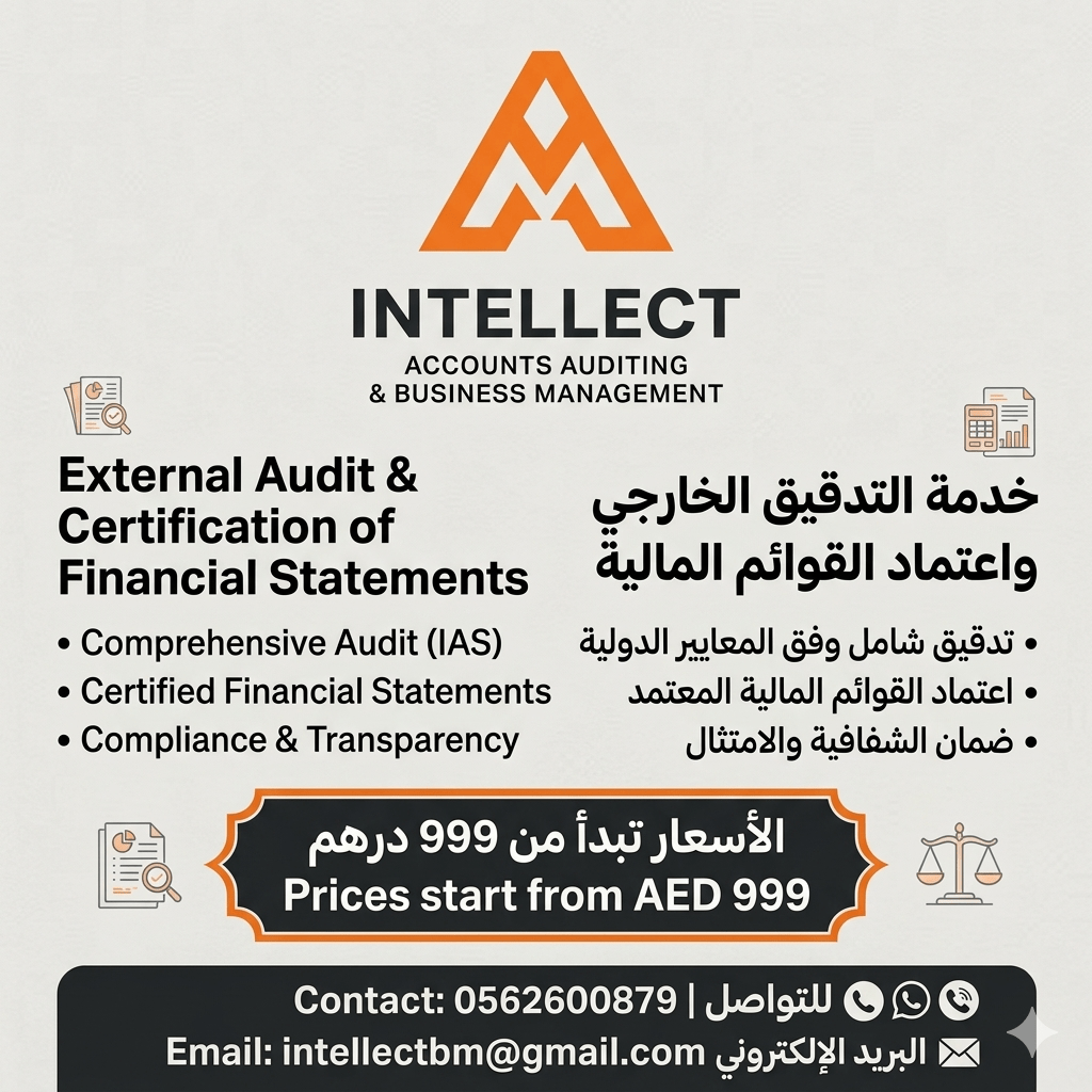 الحل الشامل والموثوق لاعتماد قوائمك المالية في الامارات هل تبحث عن شركة تدقيق خارجي معتمدة لضمان دقة وموثوقية قوائمك المالية نحن في "إنتلكت" نوفر لك باقة خدمات متكاملة مصممة خصيصا لتلبية احتياجاتك، لتتمكن من تعظيم أرباحك دون عناء الإدارة المالية. خدماتنا المتكاملة تشمل التدقيق الخارجي إجراء عمليات تدقيق خارجية شاملة ودقيقة وفقا للمعايير الدولية. ضمان الامتثال التام للمتطلبات القانونية والضريبية