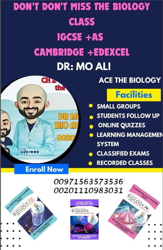 1) Biology DOCTOR FOR (IGCSE/ ACT/ EST) ONLINE AND PHYSICALLY. 2) EXPERT IN THE International SYLLABI FOR MORE THAN 24 Years. 3) COLOURED NOTES CLASSIFIED FOR All SECTIONS. 4) ONLINE EXAMS + SPECIFIC PLATFORM FOR EXAMS/ RECORDED CLASSES WATCHING THE CLASS RECORD ANYTIME. 5) TRACKING SYSTEM WITH THE PARENTS. 6) AUTOCORRECT SYSTEM) ANSWERS FOR THE MISTAKES WITH EXPLANATION ON THE ONLINE EXAMS