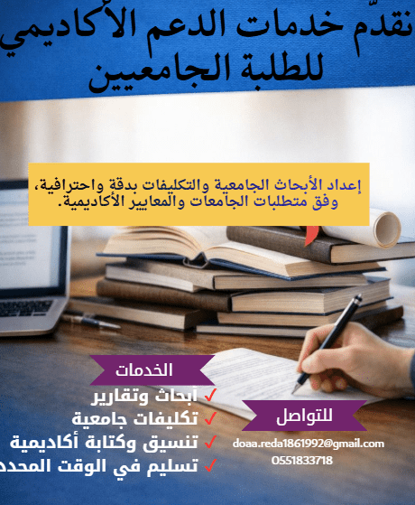 أقدم خدمات الدعم الأكاديمي للطلبة الجامعيين اعداد الأبحاث الجامعية والتكليفات بدقة واحترافية، وفق متطلبات الجامعات والمعايير الأكاديمية. أبحاث وتقارير تكليفات جامعية تنسيق وكتابة أكاديمية تسليم في الوقت المحدد الجودة والالتزام هما أولويتنا