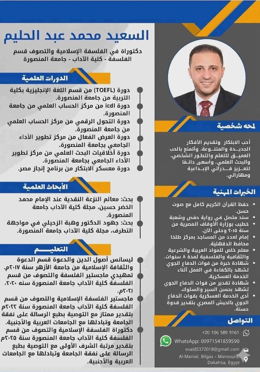 معكم د السعيد محمد دكتور الفلسفة الاسلامية، ابحث عن عمل في الجامعات أو في المدارس كمدرس أو وظيفة مناسبة في مجال التعليم، كل المقررات الدراسية في مجال الدراسات الاسلامية قادرين على دريسها بكفاءة عالية ومرفق CV بالاعلان